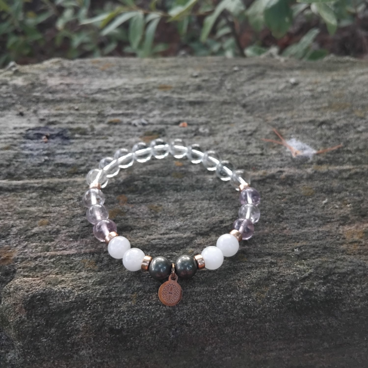 Together, all three of the stones, moonstone, ametrine and pyrite create a unique grid of energy that fasciliates your natural wealth and exudes priority treatment by design.